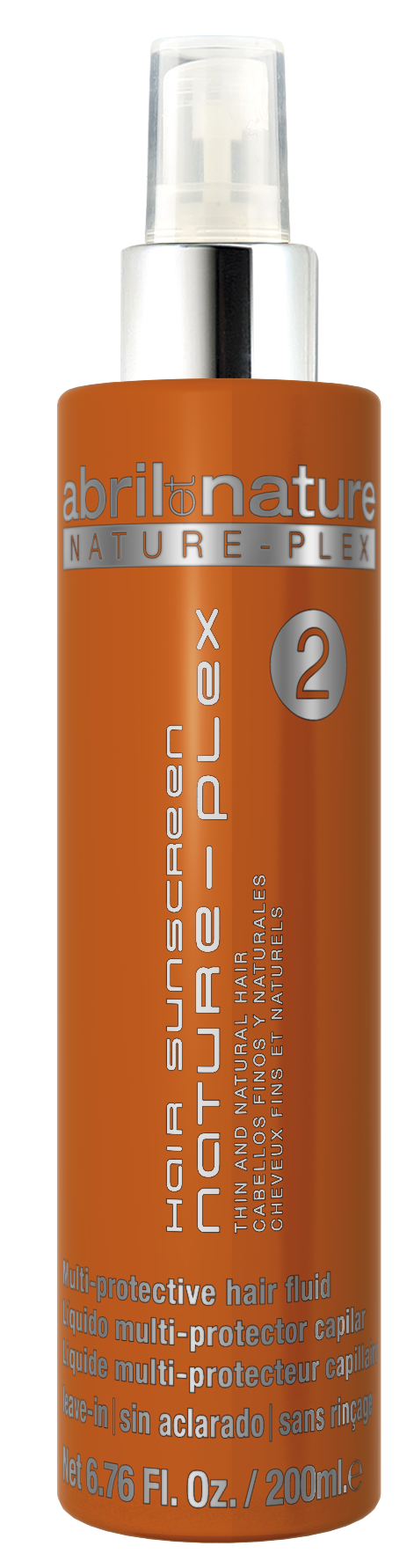 Spray Bifase Hair Sunscreen Nature Plex con extracto de cultivo de células madre vegetales, aceite de Rosa Mosqueta, ácido hialurónico, extracto de caviar y manteca de karité.